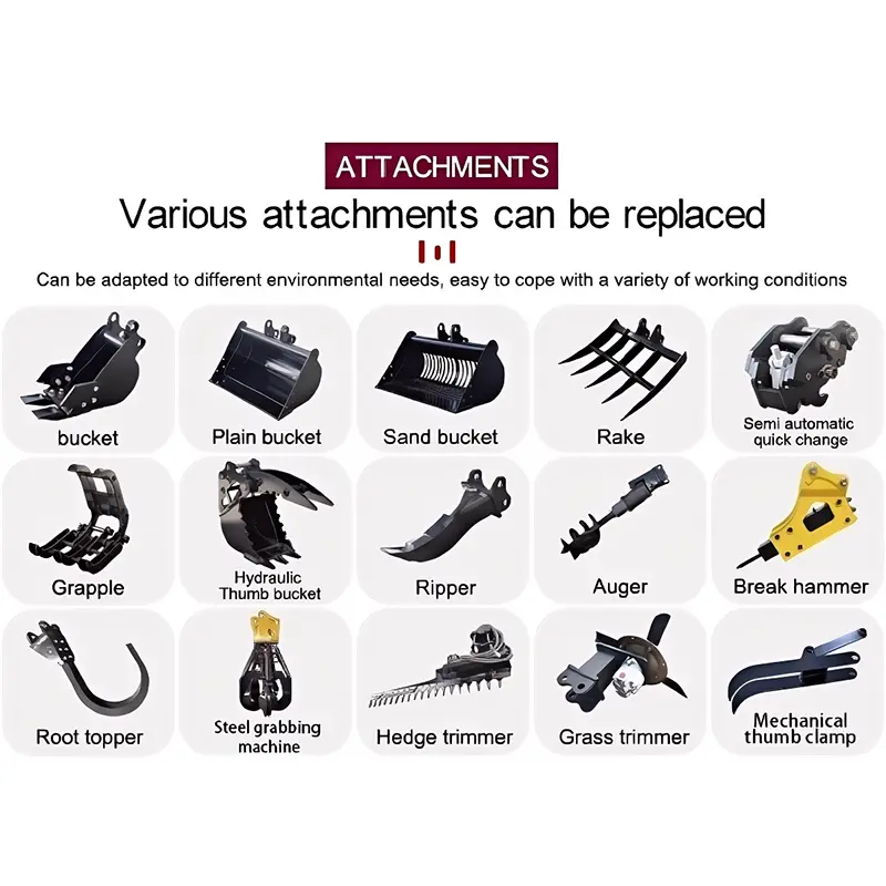 Като професионален производител на приставки за мини багери, ние произвеждаме мини багери, вариращи от 0,8 до 4 тона и предоставяме различни приставки на различни модели. Например: кофа, рейк, грайфер и др. Различни сценарии на приложение могат да бъдат постигнати чрез подмяна на различни аксесоари. Нашите продукти могат да се прилагат широко в общинското инженерство, строителната индустрия, минните операции и селскостопанските области. Нашата фабрика притежава пет работилници и монтажна линия за модерна обработка, интегрирана с ефективни, надеждни и издръжливи продукти. Всички продукти се подлагат на строги процедури за контрол на качеството, за да гарантират, че всяко оборудване, напускащо фабриката, отговаря на международните стандарти. Той е доставчик на всеобхватни решения.